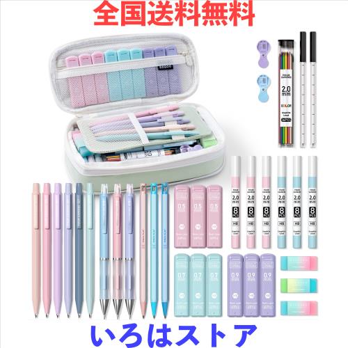 オールインワンセット このおしゃれな文房具セットには、5種類のシャープペン、0.5mmと0.7mmの芯が各13本、4B消しゴム3個、替え消しゴム18個、シャープ芯12本、そしてかわいい大容量のペンケースが含まれています。