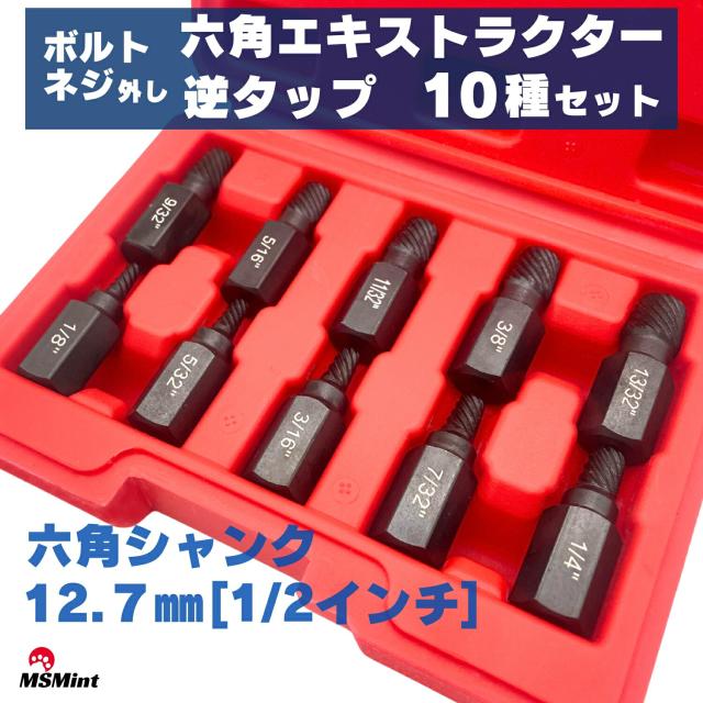 商品概要 : なめた 折れたボルトやネジの取り外しが可能なエキストラクター10本セット。全サイズ共通で12.7mm(1/2インチ)の六角シャンクを採用し高トルクに対応。逆ネジ設計で、電動ドリルやインパクトレンチを逆回転(反時計回り)させることで、食い込みながら固着したボルトを引き抜きます。