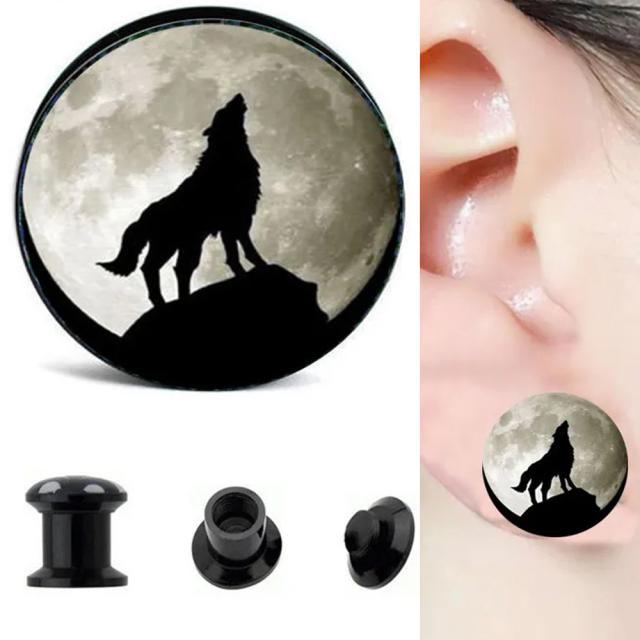 6ゲージ(6G)、4ゲージ(4G)、2ゲージ(2G)、0ゲージ(0G)、00ゲージ(00G)、12mm(1/2インチ、ハーフインチ)から選べるダブルフレアアイレット型の黒色のアクリル樹脂プラグに満月に向かって遠吠えする狼をデザインしたのボディピアス。