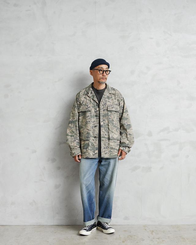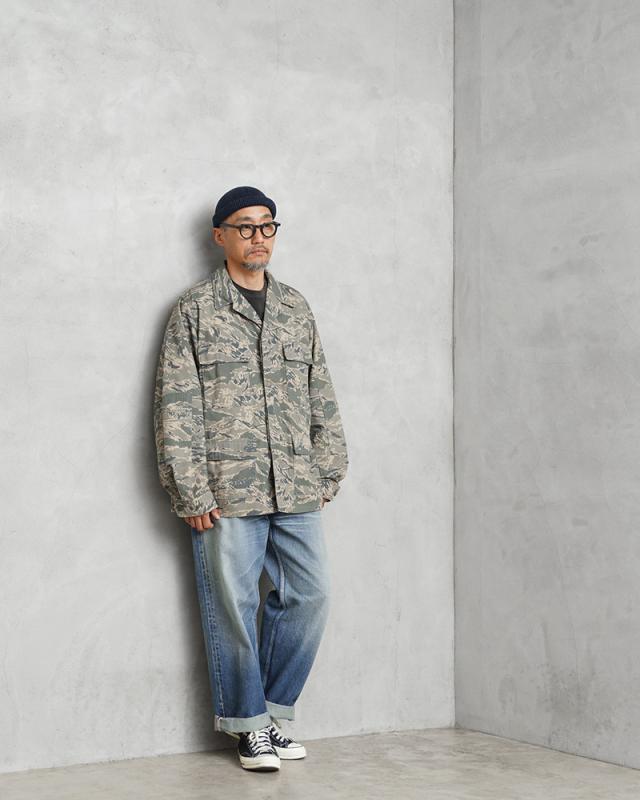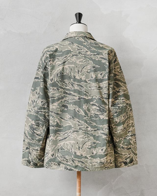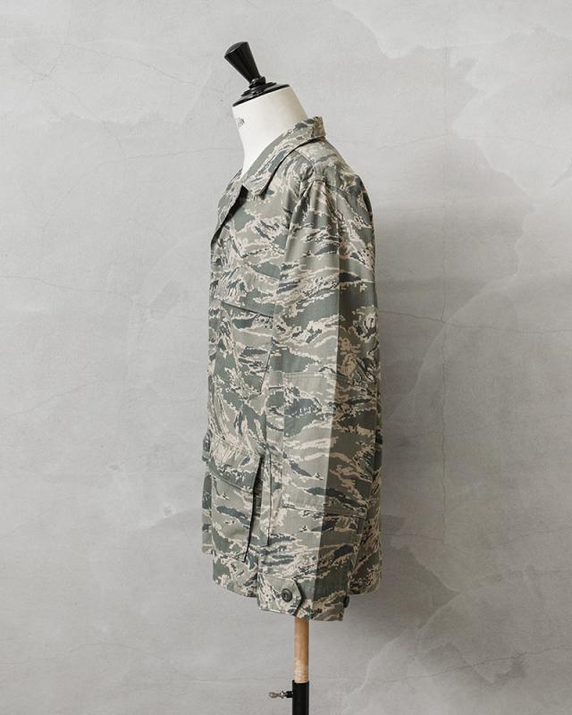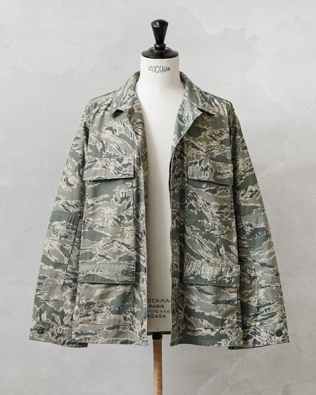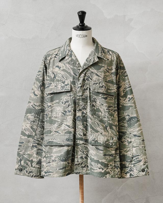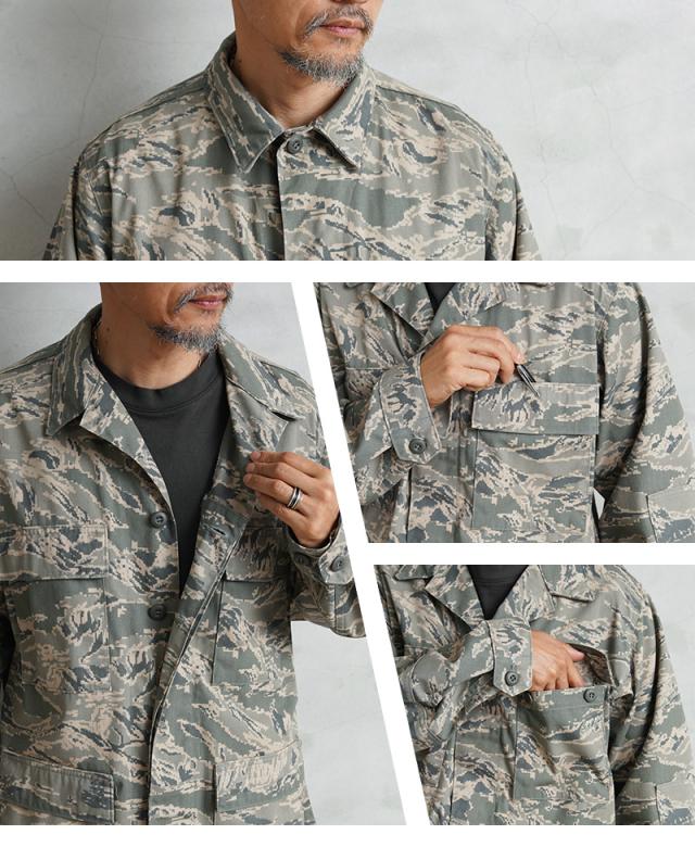 無骨さと都会的な雰囲気の両方を醸し出すデジタルタイガーカモ柄が印象的な、米空軍のユーティリティジャケットが入荷しました。空軍兵士向けに作られたジャケットで、生地は厚手のコットンナイロン素材。フロントはボタンで開閉する比翼仕立てのデザインで、袖口はボタンで調節可能です。フロントにはボタン開閉のフラップポケットが4つ付属、袖にはペン差しポケット、肘部分には摩耗を防ぐためにエルボーパッチが取り付けられています。裏地なしの万能ミリタリージャケットで、機能的で普段着に取り入れやすいカモフラージュ柄。デイリー使いはもちろん、アウトドアなどのアクティブシーンでも活躍するサープラスアイテムです。