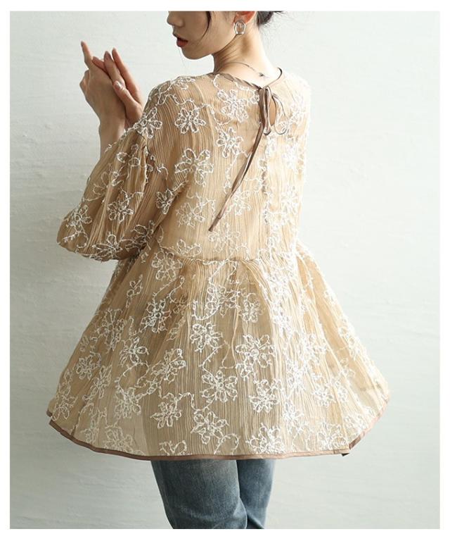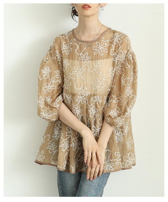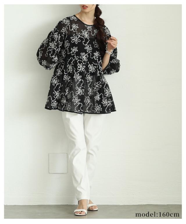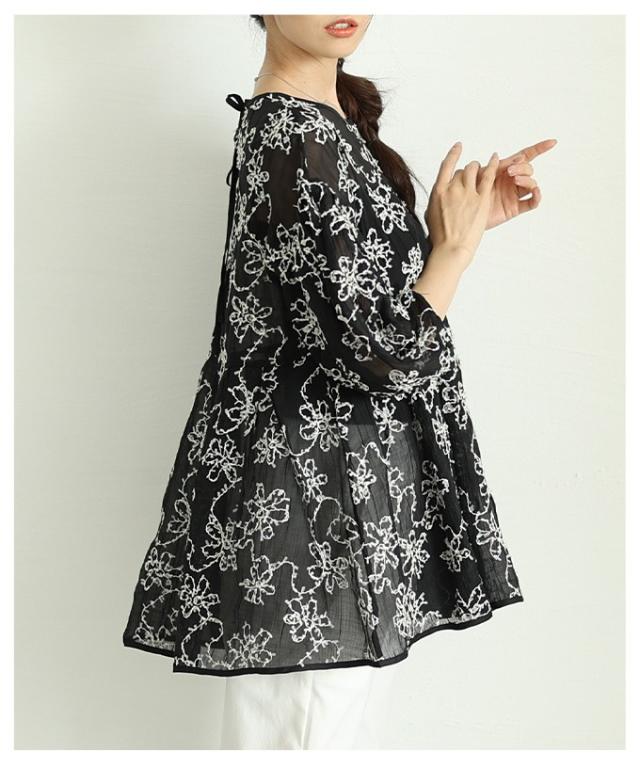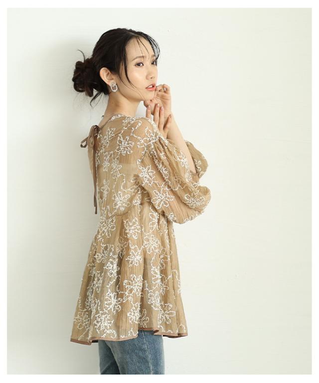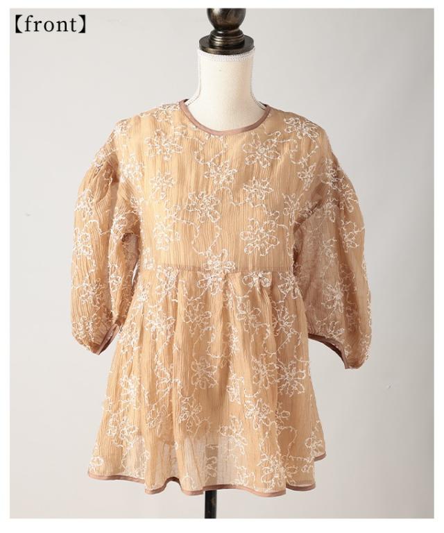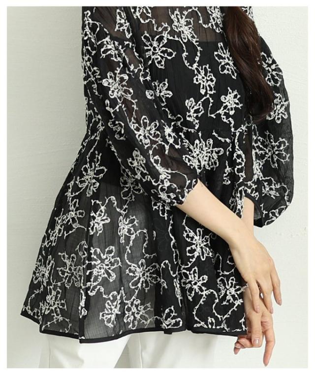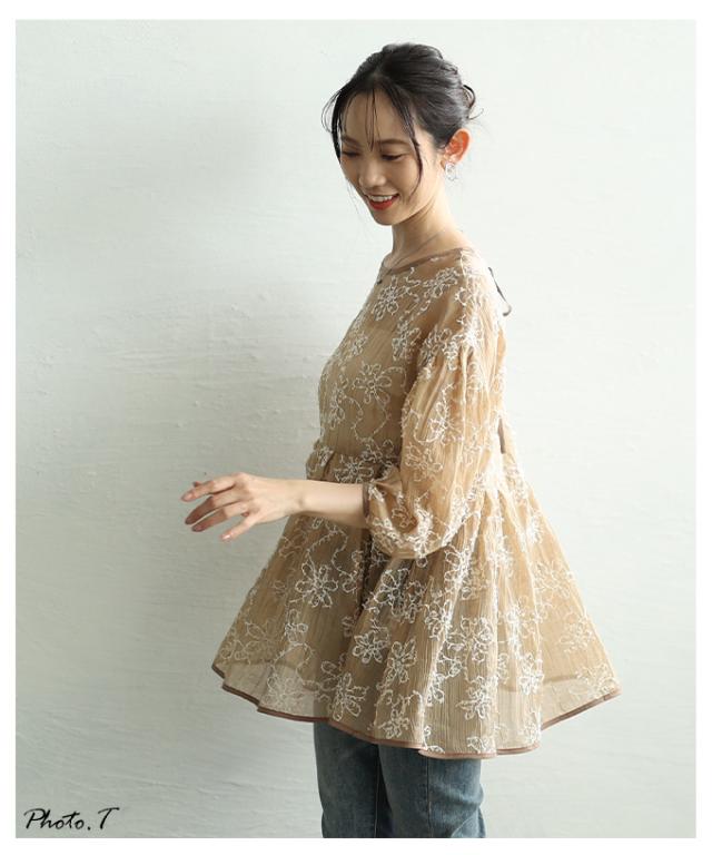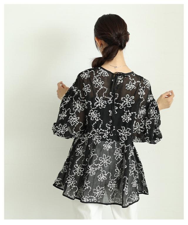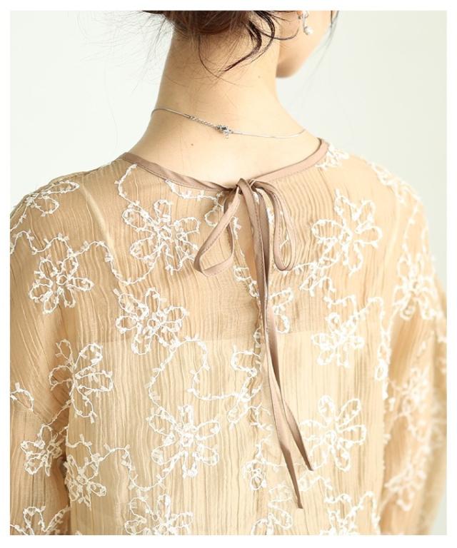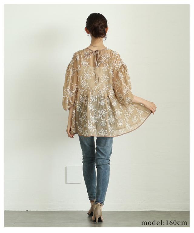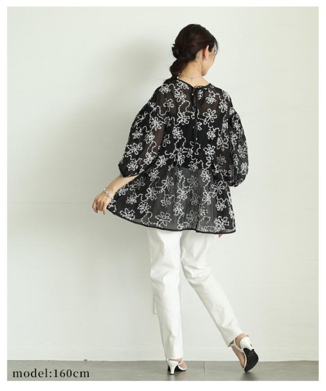 特徴: 花柄 刺繍 フリンジ風 リボン ペプラム フレア パフスリーブ 楊柳 シアー