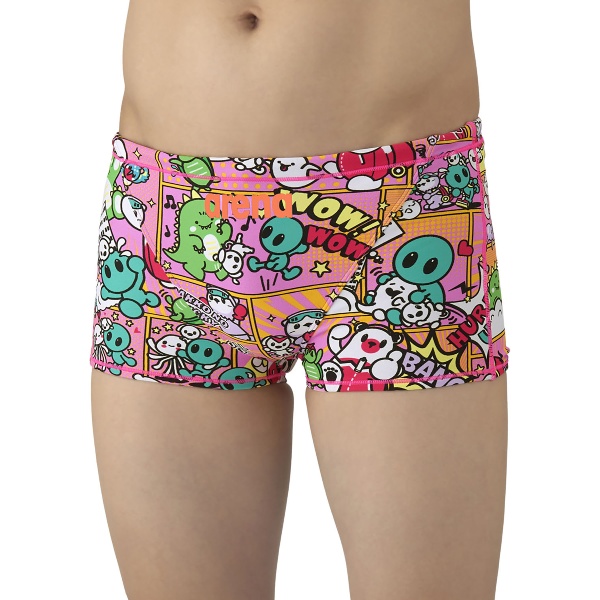 トレーニングカテゴリー「TOUGHSUITシリーズ」。大会に向けて練習を重ねる頻度が高いスイマーにオススメの練習用水着。環境に配慮したリサイクルポリエステル素材「タフスキンEP」を使用し塩素に強く長持ち。全てのスイマーに人気のARENA アリーナくんの総柄ショートレッグタイプ。AS5FWM01Mで展開するテーマ(宇宙や地球)と連動する冒険物語。アメリカンコミック調の柄は鮮やかな色合いとダイナミックな線が特徴でインパクトのあるデザイン。ARENA アリーナくんたちと地球外生命体(怪獣、宇宙人、お化け)が出会い、友達になる過程をプリントに表現。地球を守る戦隊ヒーロー風のスタイルを取り入れることで、ARENA アリーナくんたちのチームとしての一体感を演出。カラフルな4配色の展開。前身頃、後身頃共に黒の裏地付き。※この商品は縫製上、一点一点プリント柄の見え方に違いが生じますので予めご了承ください。