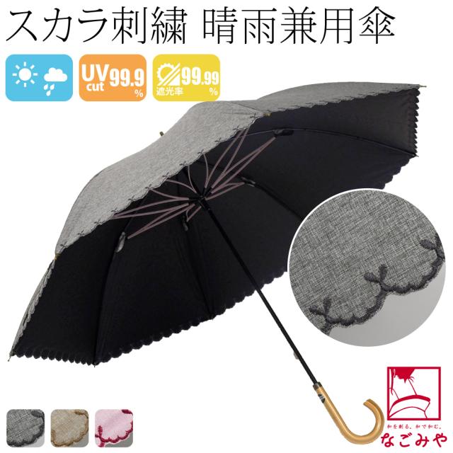 晴雨兼用 日傘 雨傘 通年用 長傘 サクラ骨 シャンブレー スカラップ刺繍 暑さ 熱中症 日焼け 紫外線 UV 対策 撥水 防水 おしゃれ 大人 レディース 女性 10024772