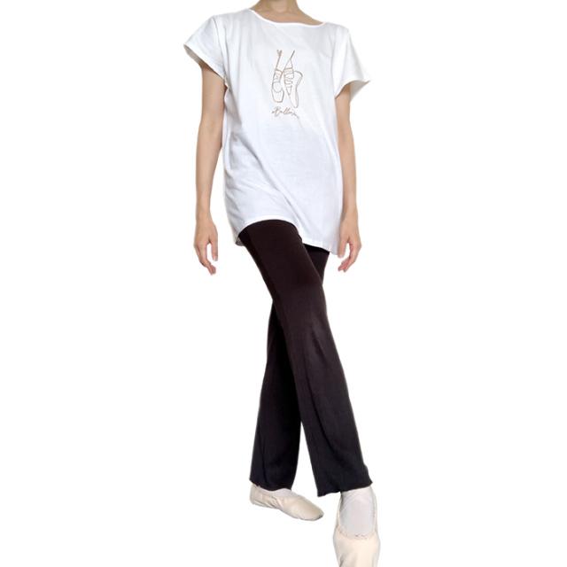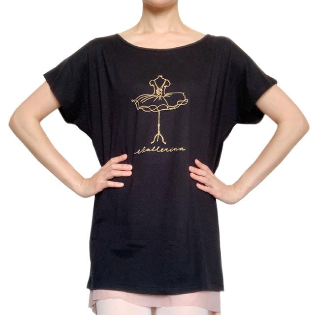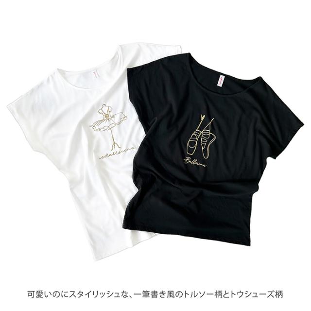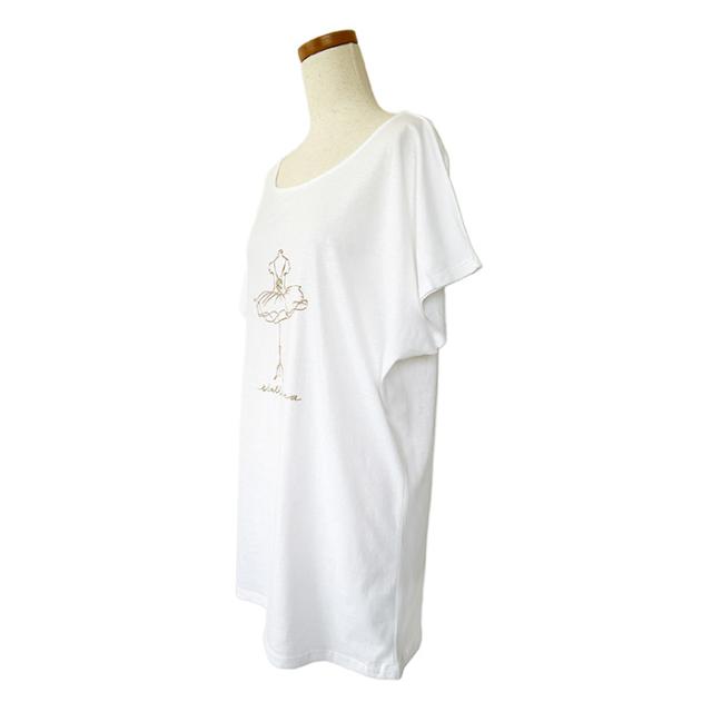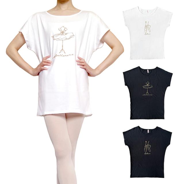 バレエ トップス Tシャツ 半袖 ロング オーバーサイズ (フリーサイズ) コットン 大人・ジュニア レディース 綿 おしゃれ かわいい イラスト バレエシャツ 幅広ネック 広い首回り ストレッチ 伸縮 お稽古着 練習着 レッスン着