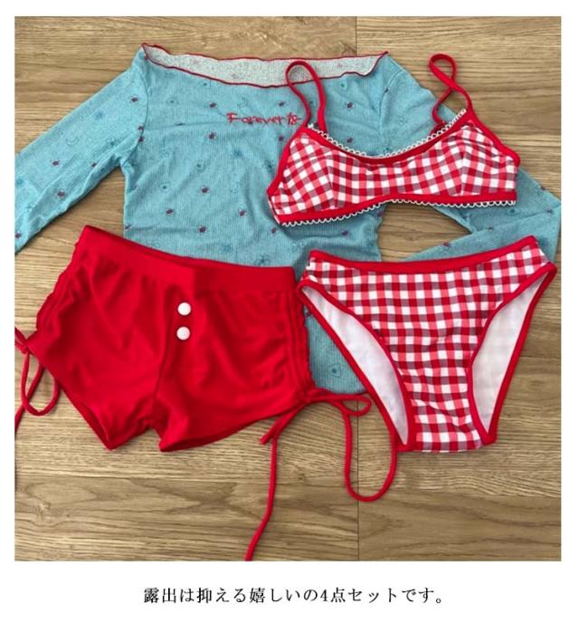 かわいい 水着 4点セット オフショルダー オフショルダー タンキニ ビキニ セパレート スイムウェア シアートップス 紫外線対策 上下セット ショートパンツ 水遊び 海水浴