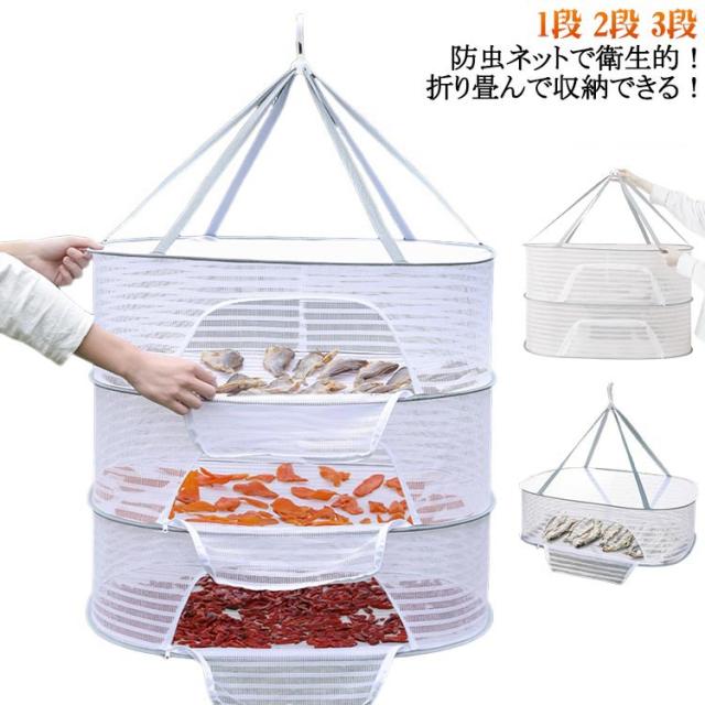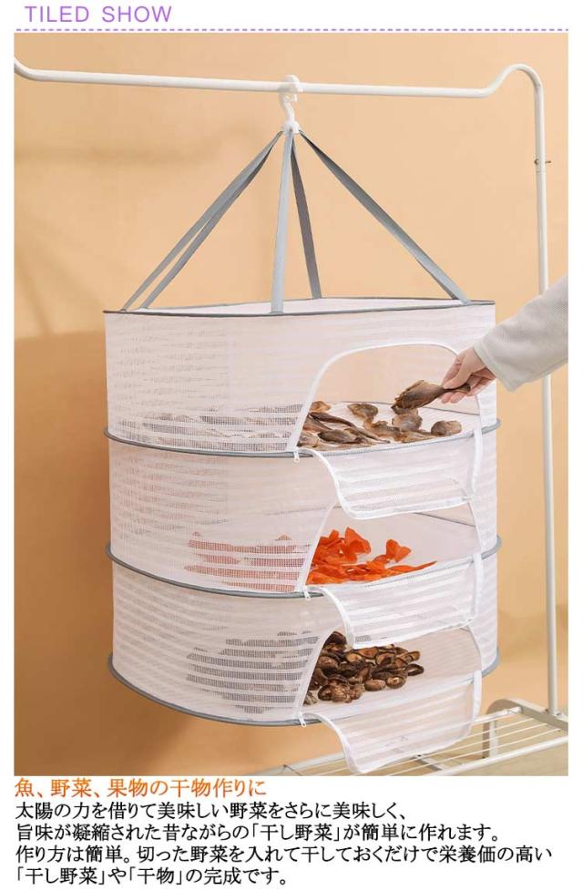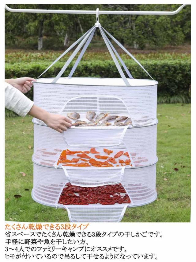 | 1段 2段 3段 防虫ネットで衛生的!折り畳んで収納できる! 魚、野菜、果物の干物作りに 太陽の力を借りて美味しい野菜をさらに美味しく、旨味が凝縮された昔ながらの「干し野菜」が簡単に作れます。作り方は簡単。切った野菜を入れて干しておくだけで栄養価の高い「干し野菜」や「干物」の完成です。 アウトドアでの食器乾燥に メッシュ素材で風通しが良いので、洗った食器の乾燥や収納としてご使用いただけます。またアウトドアでは散らかりやすい小物の一時収納スペースとしても活躍します。 たくさん乾燥できる3段タイプ 省スペースでたくさん乾燥できる3段タイプの干しかごです。手軽に野菜や魚を干したい方、3〜4人でのファミリーキャンプにオススメです。ヒモが付いているので吊るして干せるようになっています。 防虫ネットで衛生的 メッシュ生地は目が細かいので食器や食材などを虫から守ります。またアウトドア中の灰も近づけにくくなっています。 折り畳んで収納できる 使わない時は折り畳めるので、アウトドアに持っていく時もかさばらずにコンパクトに持ち運びできます。 | |