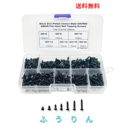PENGLIN 480個 皿頭 タッピングネジ セット M3 3mm タッピングビス 十字穴 炭素鋼 7種類 ブラック 収納ケース付き