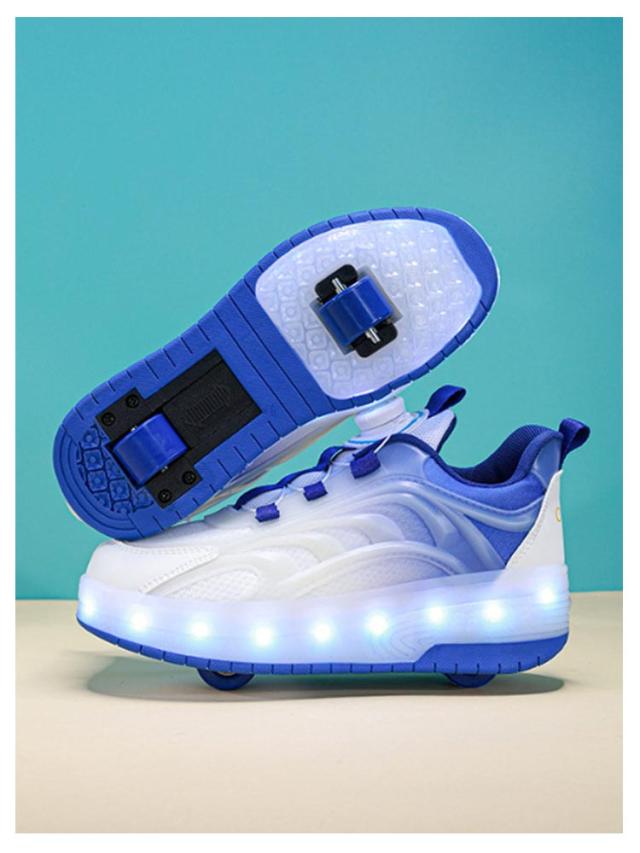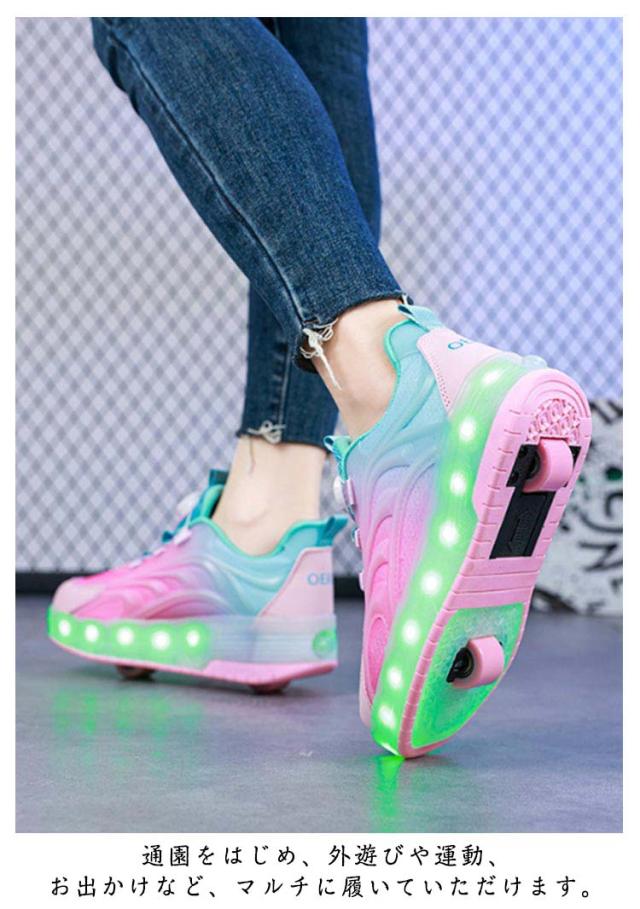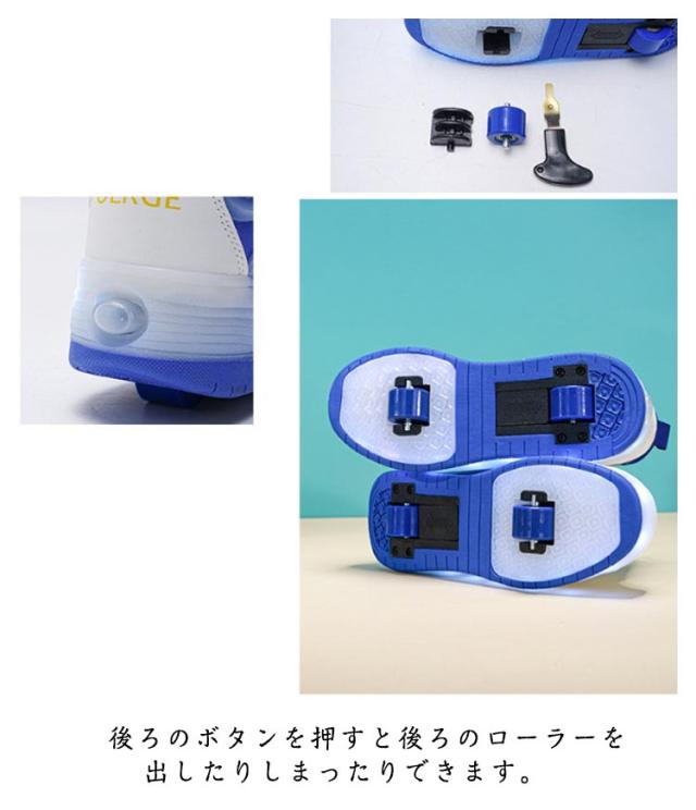 | ・おしゃれなシューズが一瞬でローラースケートに! ・歩くと、ヒールランプがピカピカ光ります。 ・ダイヤルをくるっと回して簡単にフィット感を調節できる ・後ろのボタンを押すと後ろのローラーを出したりしまったりできます。 ・付属のレバーを使って前のローラーとキャップを取ることが出来ます。 ・電池はいりません。USBケーブルで充電できす。 ・通園をはじめ、外遊びや運動、お出かけなど、マルチに履いていただけます。 | |