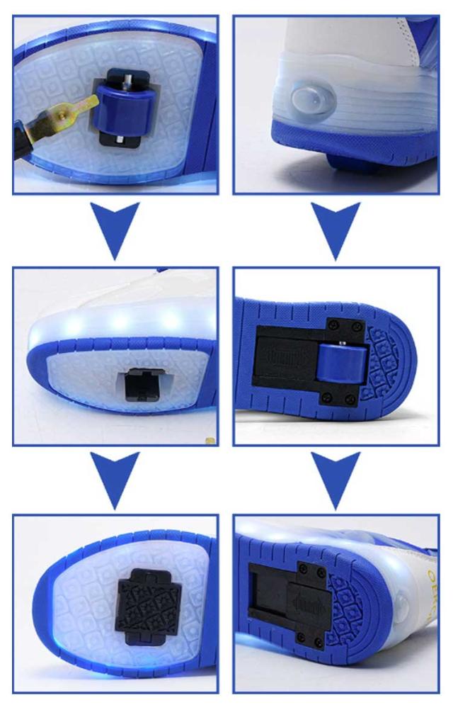 | ・おしゃれなシューズが一瞬でローラースケートに! ・歩くと、ヒールランプがピカピカ光ります。 ・ダイヤルをくるっと回して簡単にフィット感を調節できる ・後ろのボタンを押すと後ろのローラーを出したりしまったりできます。 ・付属のレバーを使って前のローラーとキャップを取ることが出来ます。 ・電池はいりません。USBケーブルで充電できす。 ・通園をはじめ、外遊びや運動、お出かけなど、マルチに履いていただけます。 | |