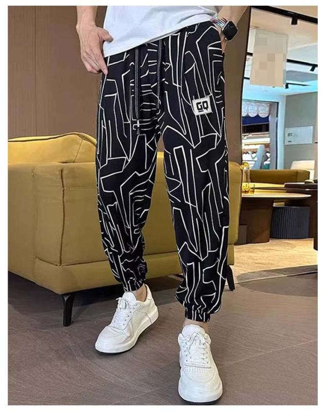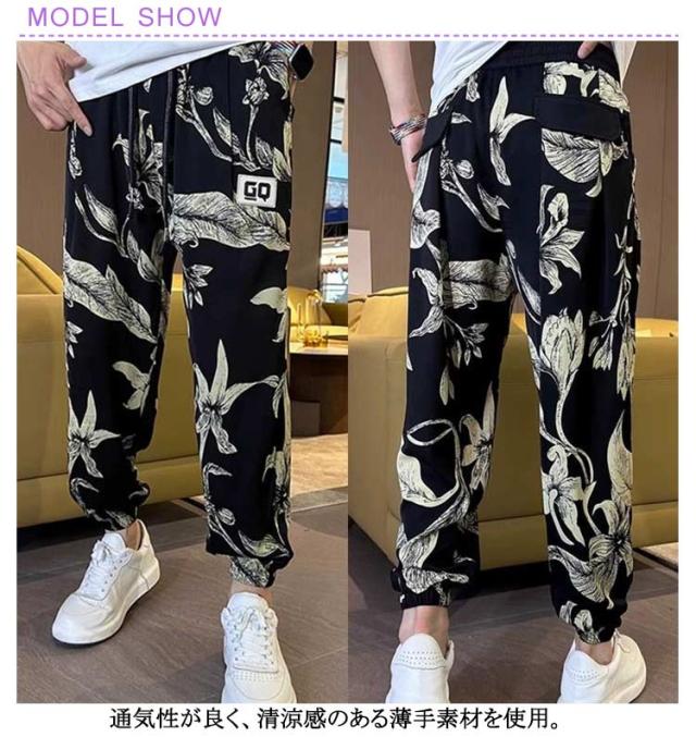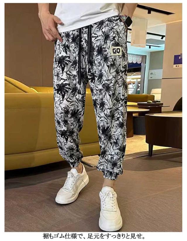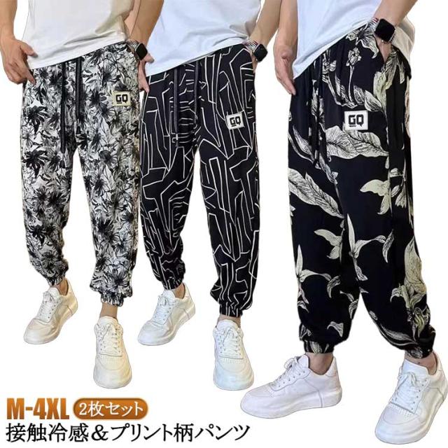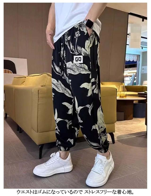 涼しい メンズ 接触冷感 プリント柄 イージーパンツ ロングパンツ 部屋着 夏 涼しい 長ズボン 薄手 サルエルパンツ ボトムス おしゃれ 総柄 ボトムス パンツ 裾ゴム ウエストゴム ルームウェア アイスシルクパンツ 大きいサイズ 涼感 ひんやり 吸汗 速乾 UVカット