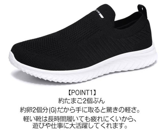 | 【男女兼用ランニングシューズ】【225−280mm】【全8色】 【point1】 ・約たまご2個ぶん 約卵2個分(g)だから手に取ると驚きの軽さ。 軽い靴は長時間履いても疲れにくいから、遊びや仕事に大活躍してくれます。 【point2】 ・ニット素材で自分サイズに。 足首にしっかりホールドするのに、肌当たりが優しいのはニット素材ならでは。 伸縮するから、サッと履くだけで自分サイズにフィットします。 【point3】 ・メッシュ素材でムレ知らず。 アッパーには耐久性と通気性に優れたメッシュ素材を採用しました。 歩くたびに空気が循環して、快適さをキープしてくれます。 | |