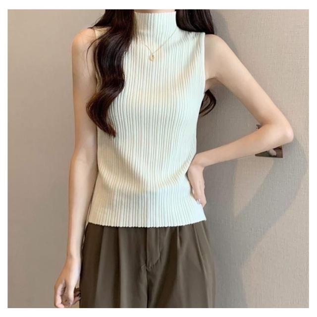 ノースリーブ Tシャツ レディース ハイネック ストレッチ プリーツ トップス 2枚セット ニットトップス ハイネックニット 夏 プリーツ シンプル 春 レイヤード サマーニット S M L XL