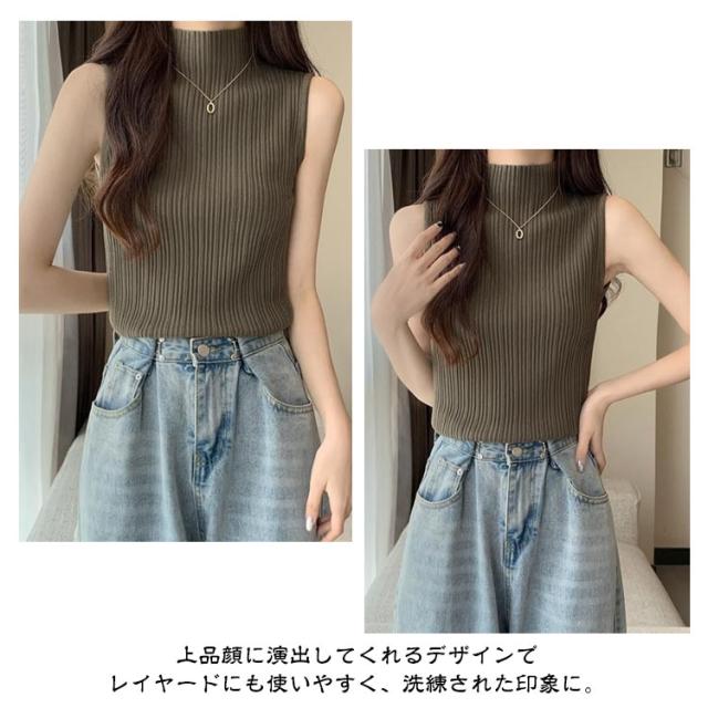 ハイネック ニットトップス ハイネックニット プリーツ インナー レディース Tシャツ 夏 タンクトップ 2枚セット プリーツ ハイネック ストレッチ 通学 レイヤード リブ カジュアル タートルネック ノースリーブ トップス 春秋 プリーツ 春 秋 夏