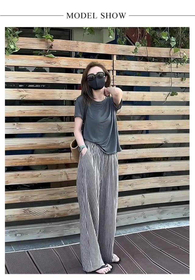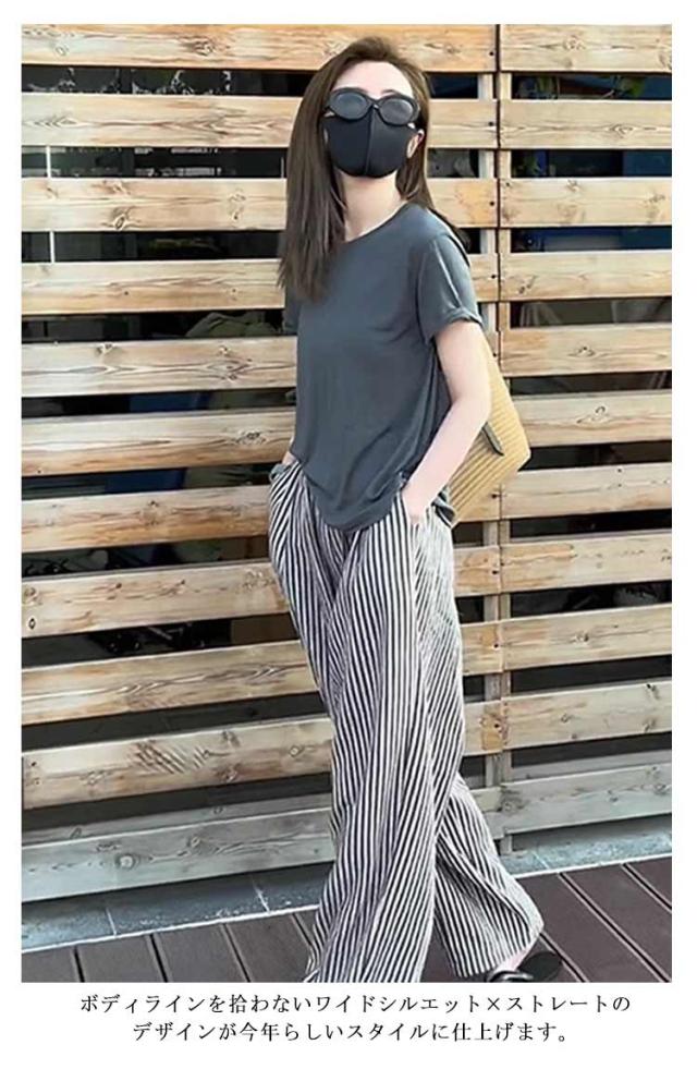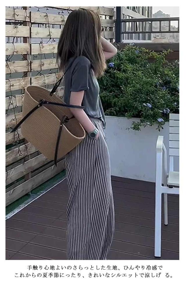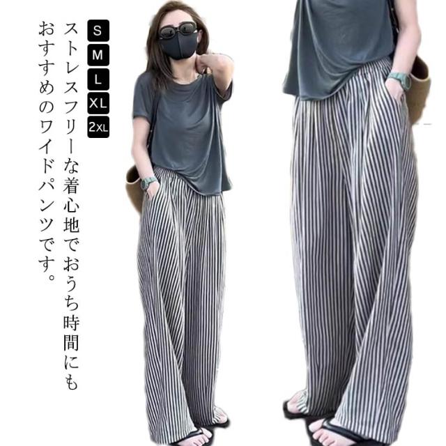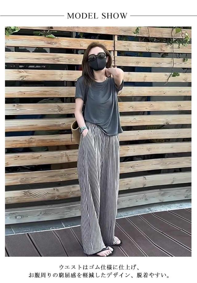 ワイドパンツ レディース 薄手 ボトムス ストレート ロングパンツ ストライプ柄 美シルエット ハイウエスト ゆったり カジュアル きれいめ 体型カバー リラックス ウェストゴム 夏物 送料無料