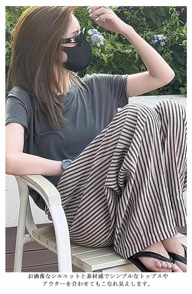 | ストレスフリーな着心地でおうち時間にもおすすめのワイドパンツです。 ウエストはゴム仕様に仕上げ、お腹周りの窮屈感を軽減したデザイン、脱着やすい。 ボディラインを拾わないワイドシルエット×ストレートのデザインが今年らしいスタイルに仕上げます。 スタイリッシュなストライプ柄が美脚効果を演出し、スタイルアップを叶えます。 手触り心地よいのさらっとした生地、ひんやり冷感でこれからの夏季節にったり、きれいなシルエットで涼しげ る。 お洒落なシルエットと素材感でシンプルなトップスやアウターを合わせてもこなれ見えします。 | |
