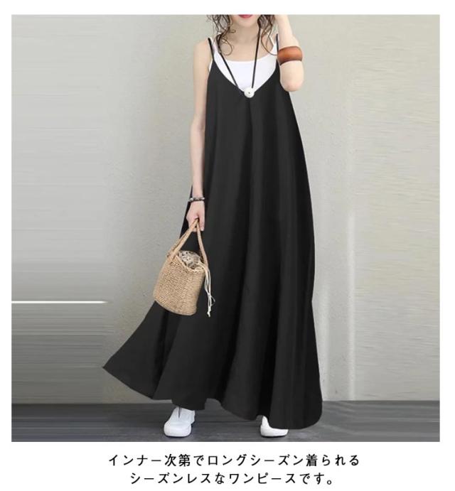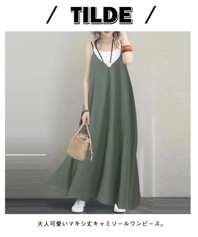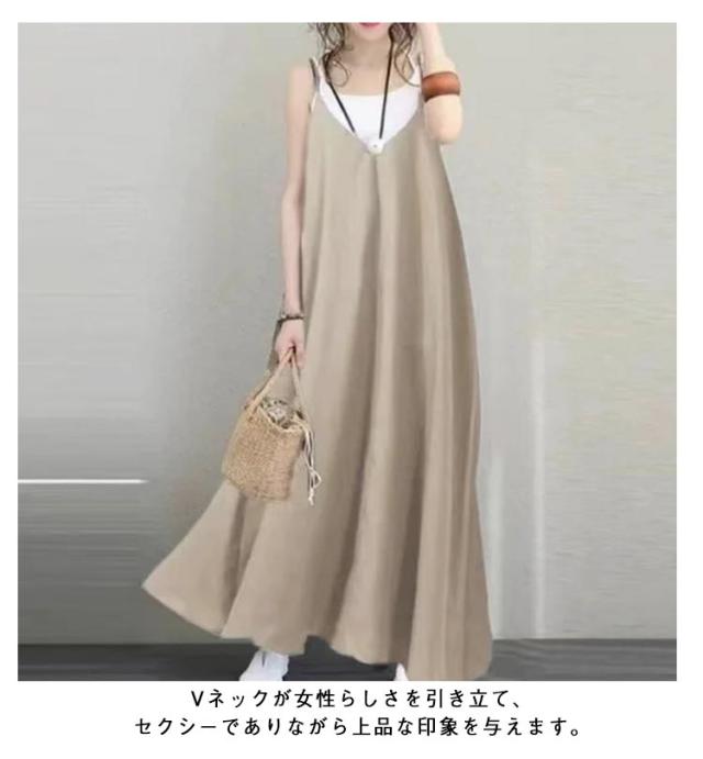 | 【セクシーでエレガント】 【Vネックキャミソールワンピース】 【大人可愛いマキシ丈】 大人可愛いマキシ丈キャミソールワンピース。 Vネックが女性らしさを引き立て、セクシーでありながら上品な印象を与えます。 ゆったりとしたシルエットで、体型を気にせずにリラックスして着られます。 軽やかな素材で、暑い季節でも涼しく快適に過ごせます。 インナー次第でロングシーズン着られるシーズンレスなワンピースです。 | |
