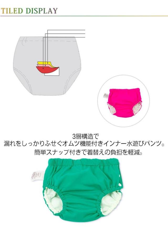 | 【おむつ機能付きで安心!】【ベビー用スイムパンツ】【男女兼用 70−100cm】 3層構造で漏れをしっかりふせぐオムツ機能付きインナー水遊びパンツ。 簡単スナップ付きで着替えの負担を軽減。 ウエストと太ももはゴムでぴったりフィットし固形物をもらしません。 TPU層は吸収した水分を逃さない防水層。 通気性が良い素材を使用しており、赤ちゃんが長時間着用しても蒸れません。 プールや水泳学習に最適なアイテムです。 | |