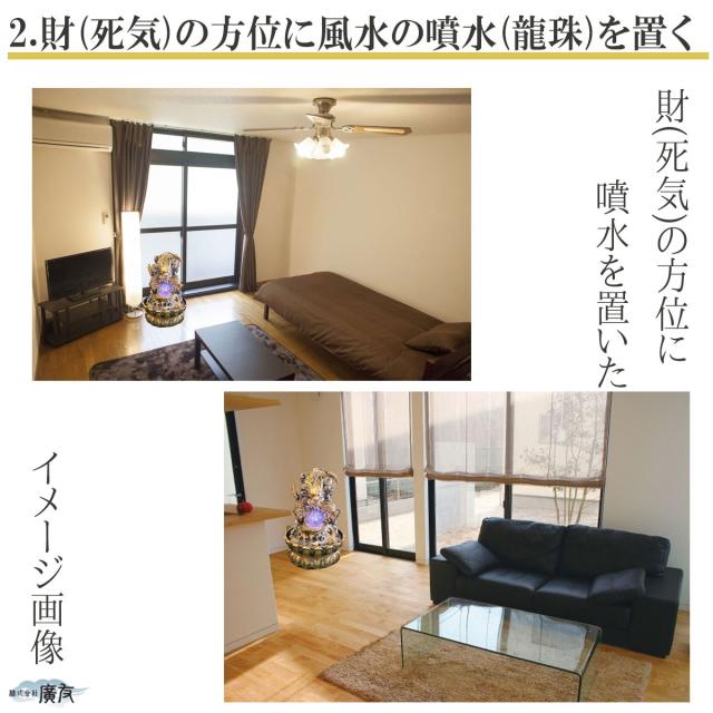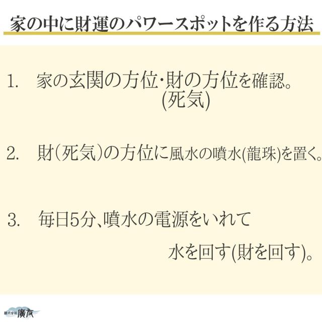 死気に動く水のものを置くと、死気が金運・財運を招く「財位」に変わると言われています。