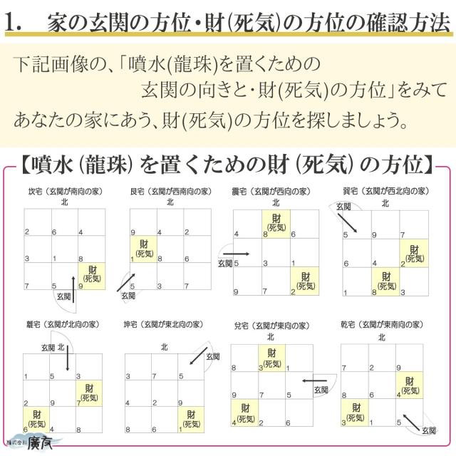 紫白九星派とは、「玄関の向き」で家の中を八方位に分ける風水の代表的な派で、この紫白九星派で八方位に分けた内の「死気」の方位に『龍珠』を置いていただくのがオススメです。