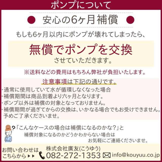通常のご使用状況において、「水が循環しなくなった」など、ポンプに故障が生じた場合は、ご注文日から半年間は無償でポンプを交換させていただきます。