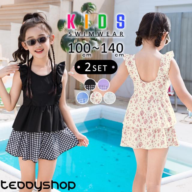 夏新作 キッズ 水着 女の子 セパレート トップス ペプラム ノースリーブ スカート ショートパンツ一体型 2点セット チェック 花柄 フリル フレア 裏地付き パッド付き 一部サイズのみ 幼稚園 保育園 小学生 低学年 高学年 海 黒