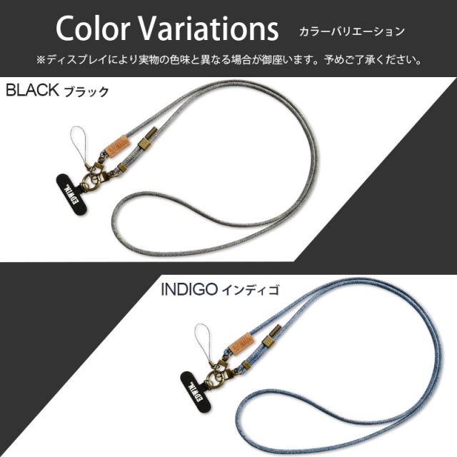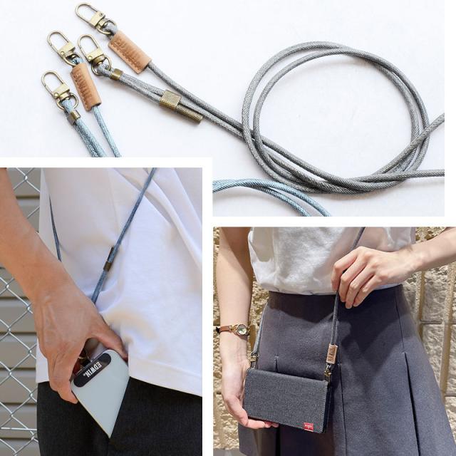 デニム風カラーのストラップに型押しのレザータグが特徴的なスマホショルダーストラップです。