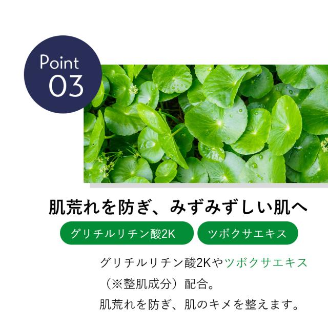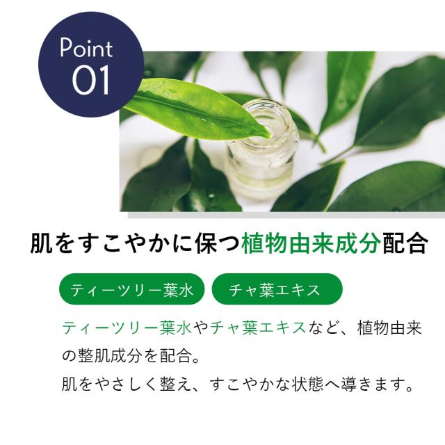 | 全成分 | ティーツリー葉水 、BG 、水 、DPG 、1,2- へキサンジオール、メチルグルセスー20、カプリン酸ポリ ゲリセリルー4、ペンチレングリコール、カプリリルグリコール、ベタイン、キシリチルグルコシド、カルボマー、無水キシリトール、アルギニン、オクトキシグリセリン、ツボクサエキス、キシリトール、アラントイン、グリチルリチン酸2K、ヒアルロン酸Na、キサンタンガム、(アクリル酸ヒドロキシエチル/アクリロイルジメチルタウリンNa)コポリマー、イタドリ根エキス、オウゴン根エキス、EDTA-2Na、グルコース、ティーツリー葉油、チャ葉エキス、カンゾウ根エキス、シクロデキストリン、カミツレ花エキス、ローズマリー葉エキス、フナバラソウェキス、イソステアリン酸ソルビタン、マデカッソシド |