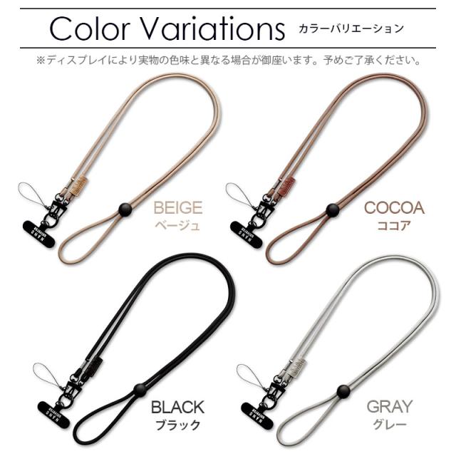 先端にはナスカン・丸カン・紐ストラップ・ロゴ付きフォンタブと豊富なバリエーションを備えており、iPhone/Xperia/Galaxy/AQUOSなど様々な機種ケース・使用シーンに対応しております。