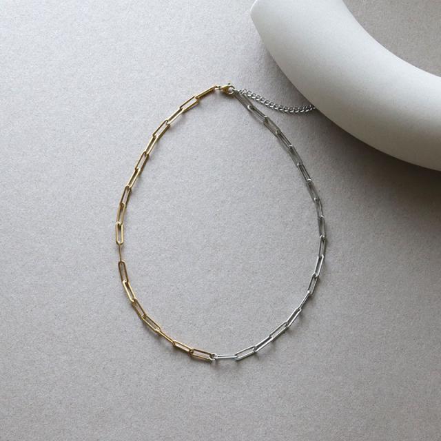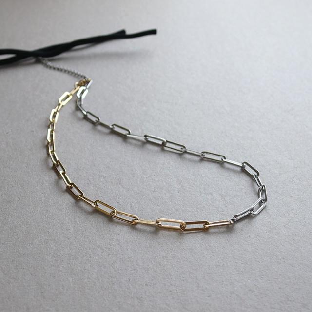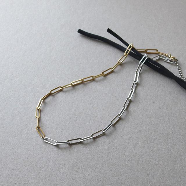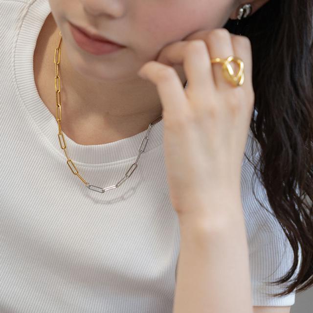 左右で異なるゴールドとシルバーのMIXカラーが胸元にアクセントを与えてくれる、シンプルデザイン。