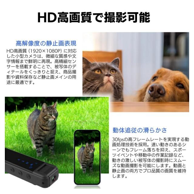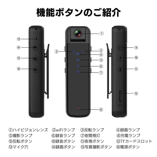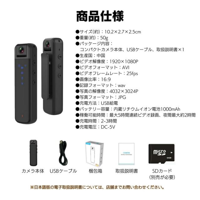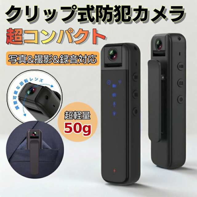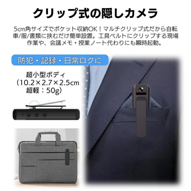 【小型スパイカメラ実用性&携帯便利】この小型ボディカメラは珍しいです、サイズ(10.2×2.7×2.5)超軽量50g、バッククリップ式にデザインされ、様々なシーンにご利用いただけます。手にすっぽり収まるカメラは、鞄やポケットに収納して、どこにでも持ち運べます。外出時に服或は自転車に挟んだり、室内には文机、ペンホルダー、本棚などに置くこともできます。また、ビジネス会議、会議議事録、授業中にメモするにもご利用いただけます。