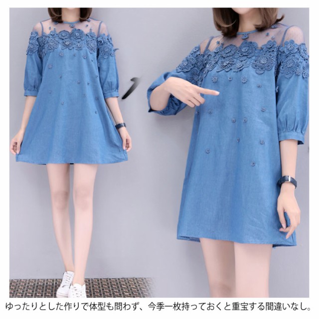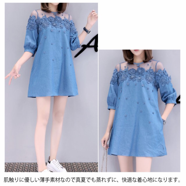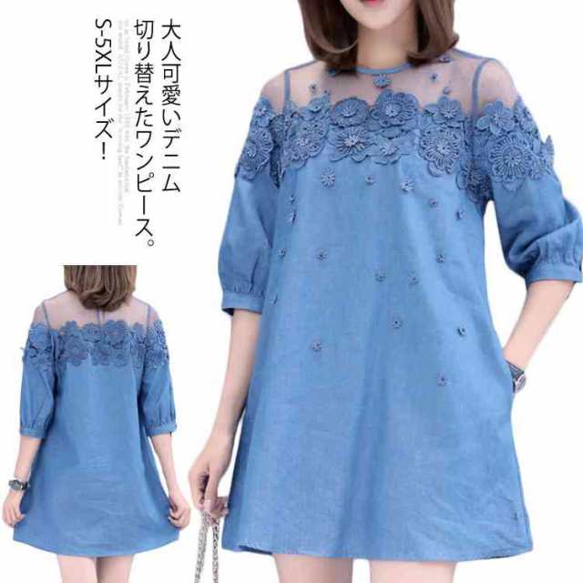 S-5XLサイズ!シースルー&刺繍入りがさりげないアクセントに デニムワンピース 切り替え ワンピース 夏 七分袖ワンピース 花柄刺繍 夏ワンピース 膝上丈 大きサイズ ゆったり 可愛い送料無料
