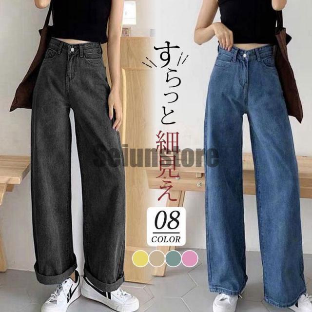 デニムパンツ レディース ジーンズ ズボン ボトムス ワイド ハイウエスト ロング丈 カシュアル 体型カバー ゆったり 美脚 春秋 細身 ストレッチ
