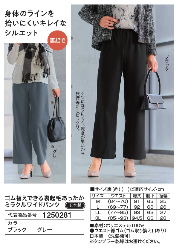 日本製 ゴム替えできる裏起毛あったかミラクルワイドパンツ 全2色 ワイドパンツ ズボン ブラック グレー レディース 婦人服 ミセス シニア 女性 大人 裏起毛パンツ 暖かい あったかい 黒 灰色 無地 シンプル 上品 40代 50代 60代 70代 80代 母の日 お母さん 秋冬 dz p27480