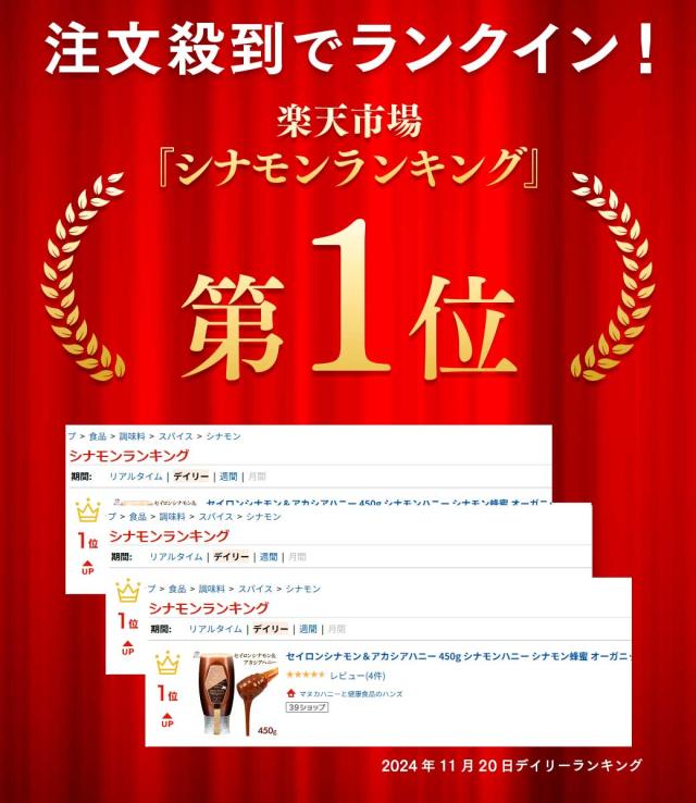 | 原産国 | 有機シナモン:スリランカ アカシアハニー:ハンガリー |