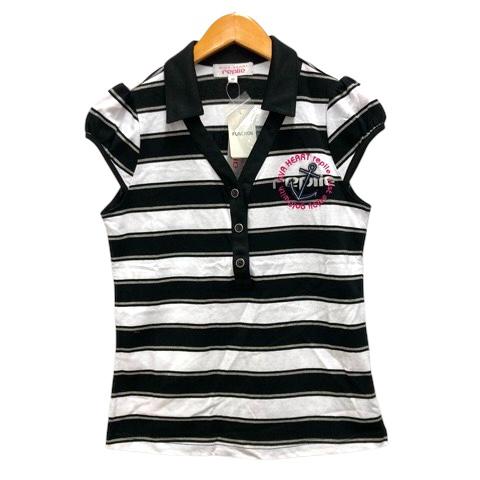 【中古】未使用品 ビバハート VIVA HEART ポロシャツ Vネック ボーダー ロゴ刺繍 半袖 40 黒 ブラック 白 ホワイト レディース
