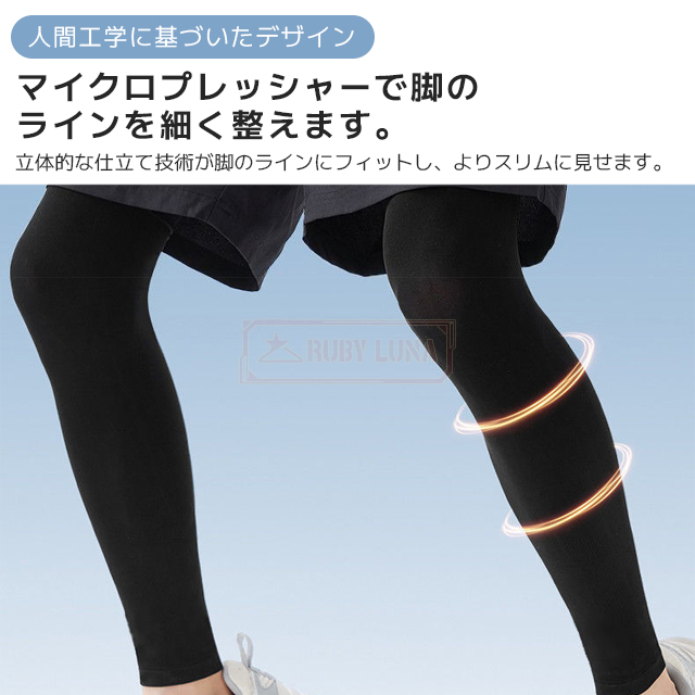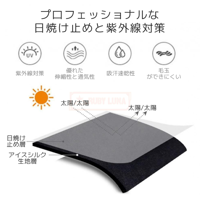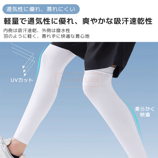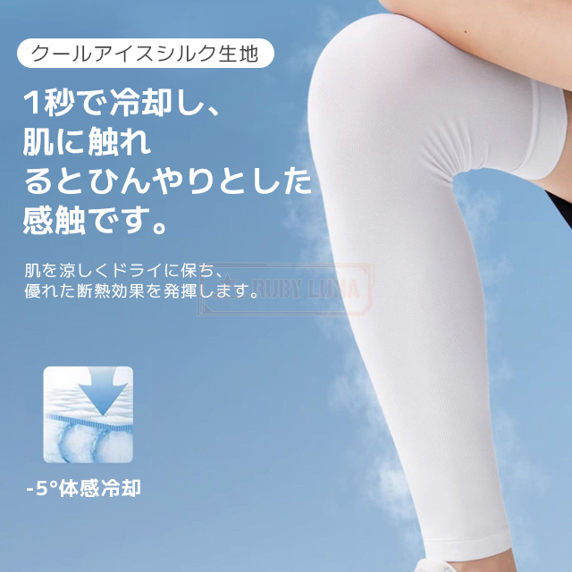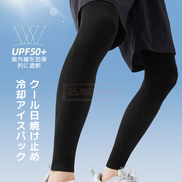 | 【日焼け防止】 | ◆UVカットアイスシルク素材(UPF50)により、脚を紫外線による日焼けから守ります。 ◆真夏はもちろん、春秋の強烈な紫外線から足を保護し赤くなったり炎症を起こすのを防ぎます。 |