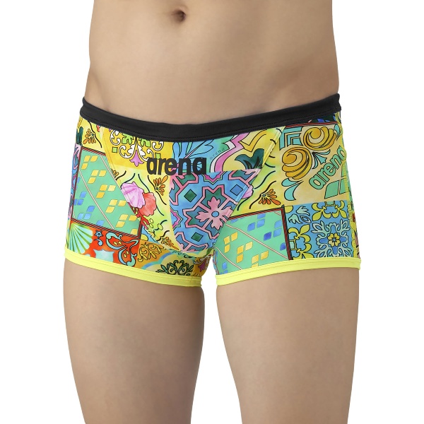 トレーニングカテゴリー「TOUGHSUITシリーズ」。大会に向けて練習を重ねる頻度が高いスイマーにオススメの練習用水着。環境に配慮したリサイクルポリエステル素材「タフスキンT2E」を使用し塩素に強く長持ち。シーズンテーマのFUSION COLORSの総柄ショートレッグタイプ。シンガポールの多民族・多文化の共存と相互尊重によって生み出されたプラナカン文化をオマージュし、豊かな色彩が特徴的な人種や文化の交わりをカラフルな4配色で表現。プラナカン建築の装飾に用いられるプラナカンタイルと呼ばれる、花や果物、鳥などを多彩に色付けしたレリーフ調のタイルをモチーフに採用。プラナカンの伝統的な美しい模様を現代のスタイルとアリーナのロゴやチームライン、水と親和性のあるモチーフを融合させ、アリーナオリジナルの柄を作成。鮮やかな色合いと繊細なディティールが特徴で視覚的に豊かでありながらクラシックな雰囲気を表現。前身頃、後身頃共に黒の裏地付き。※この商品は縫製上、一点一点プリント柄の見え方に違いが生じますので予めご了承ください。