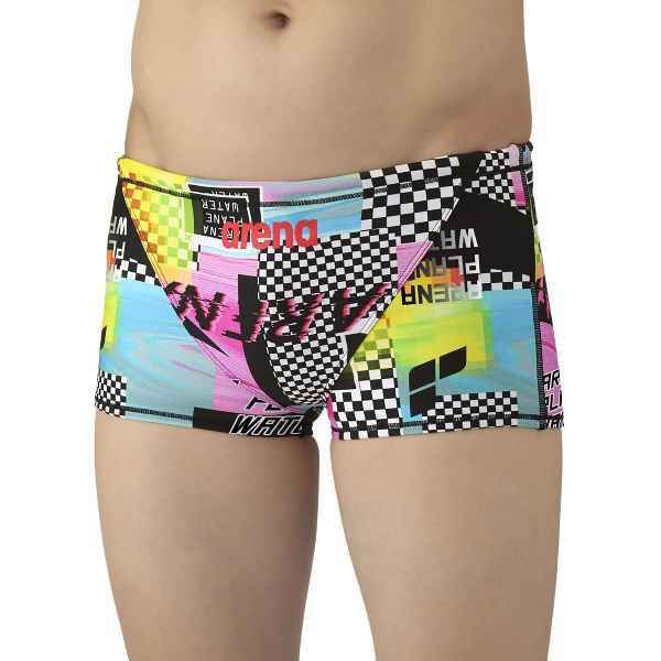トレーニングカテゴリー「TOUGHSUITシリーズ」。大会に向けて練習を重ねる頻度が高いスイマーにオススメの練習用水着。環境に配慮したリサイクルポリエステル素材「タフスキンT2E」を使用し塩素に強く長持ち。ランダムな色の変化やエフェクトが生み出す動きのあるグリッチアート柄を取り入れたスタイル。デジタル感とレトロな要素を融合させたデザイン。前身頃、後身頃共に黒の裏地付き。ショートレッグタイプ。※この商品は縫製上、一点一点プリント柄の見え方に違いが生じますので予めご了承ください。