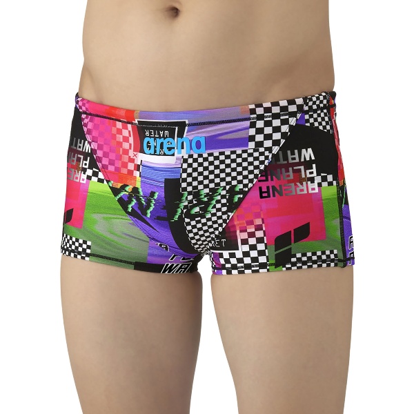 トレーニングカテゴリー「TOUGHSUITシリーズ」。大会に向けて練習を重ねる頻度が高いスイマーにオススメの練習用水着。環境に配慮したリサイクルポリエステル素材「タフスキンT2E」を使用し塩素に強く長持ち。ランダムな色の変化やエフェクトが生み出す動きのあるグリッチアート柄を取り入れたスタイル。デジタル感とレトロな要素を融合させたデザイン。前身頃、後身頃共に黒の裏地付き。ショートレッグタイプ。※この商品は縫製上、一点一点プリント柄の見え方に違いが生じますので予めご了承ください。