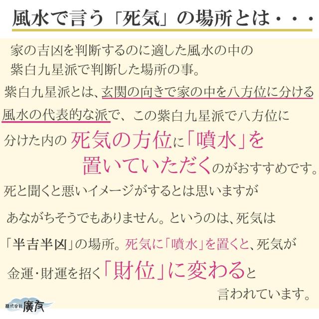 紫白九星派とは、「玄関の向き」で家の中を八方位に分ける風水の代表的な派で、この紫白九星派で八方位に分けた内の「死気」の方位に『龍珠(噴水)』を置いていただくのがオススメです。