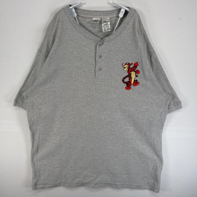 古着 ディズニー Disney 半袖Tシャツ ヘンリーネック キャラクター ティガー 刺繍 大きいサイズ L グレー 無地 メンズ