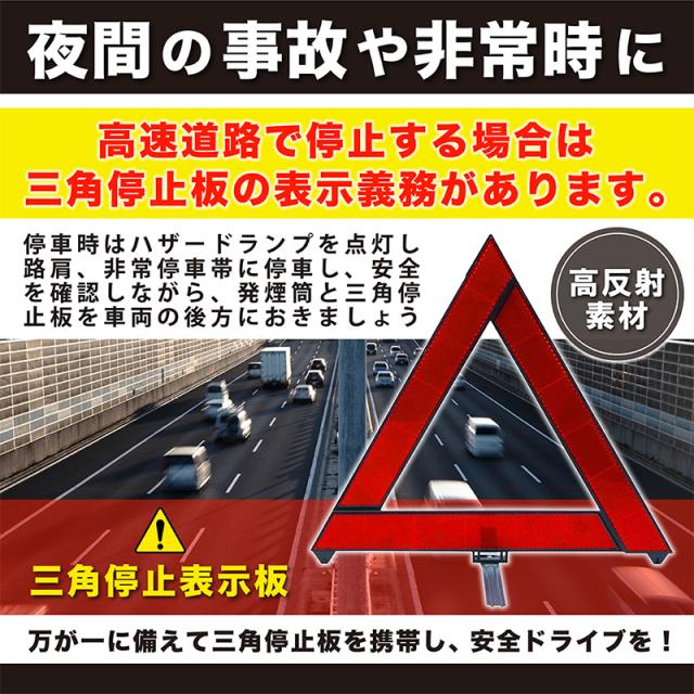 高速道路などでの事故や緊急停車には三角停止表示板の表示義務がございます。