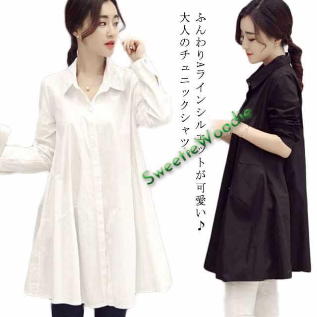 シャツワンピース チュニック 長袖 Aライン レディース フレア ワンピース 送料無料 体型カバー 着痩せ 韓国ファッション 通勤 ポケット付き 春秋 秋服 羽織 オフィス 黒 白