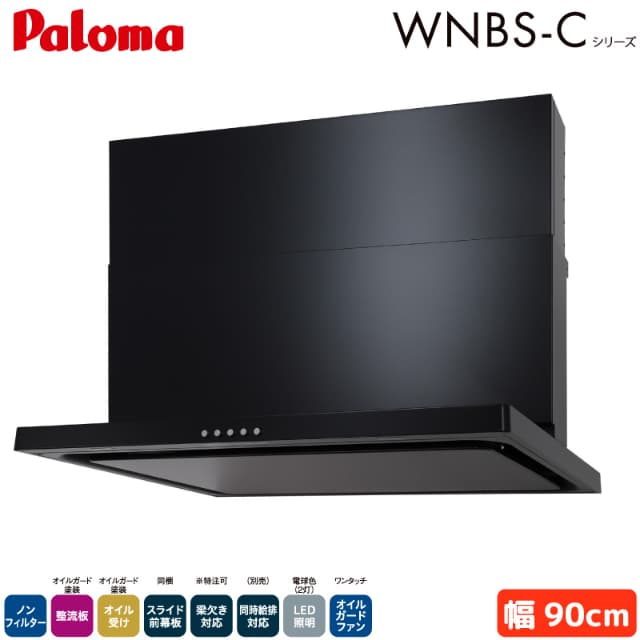 パロマ レンジフード 幅90cm WNBSK907CDMKL/R WNBS-Cタイプ シロッコファン 右排気 左排気 ノンフィルター ブラック 受注生産 Paloma