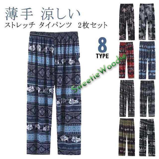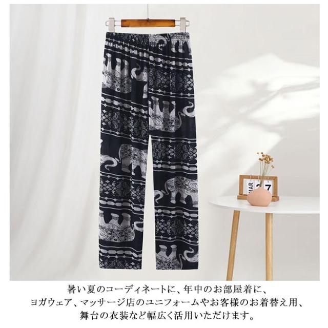 | 薄手 涼しい ストレッチ タイパンツ 2枚セット 人気のゾウさん柄のエスニックなロングパンツ♪ サラサラの薄手素材は涼しくて締め付けもなく穿き心地最高! ゆったりとしたシルエットでリラックスムード漂う一着。 ストレッチ抜群でストレスフリー☆ 暑い夏のコーディネートに、年中のお部屋着に、ヨガウェア、マッサージ店のユニフォームやお客様のお着替え用、舞台の衣装など幅広く活用いただけます。 | |