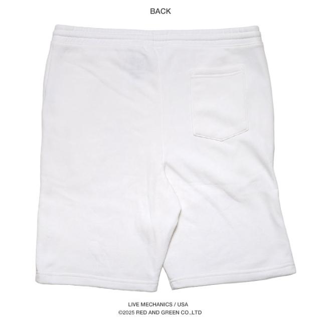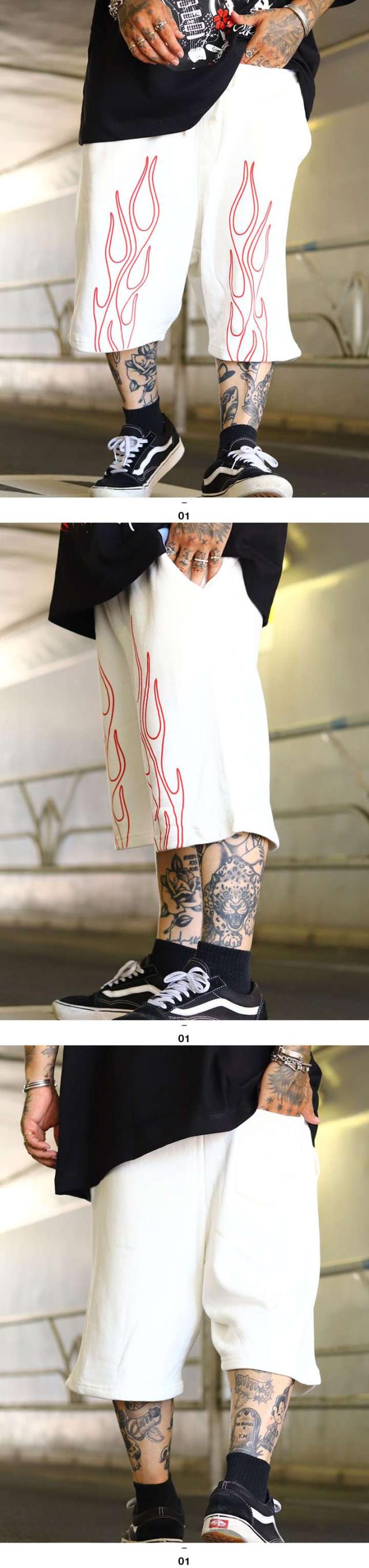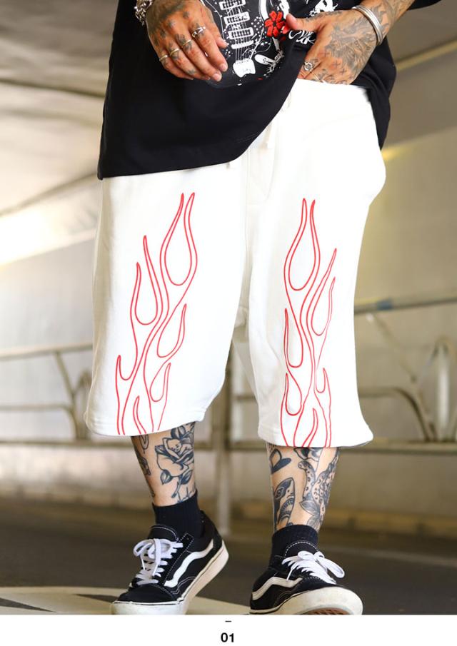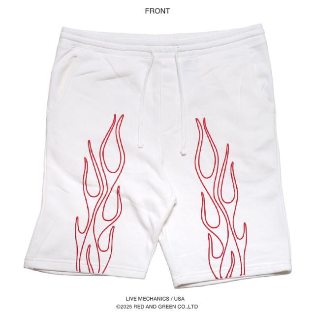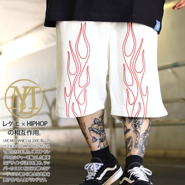LIVE MECHANICS ハーフパンツ スウェット 裏起毛 半ズボン 短パン メンズ 白 大きいサイズ ライブメカニクス ショートパンツ ファイヤーパターン フレアパターン 炎 火 総柄 大人 b系 ヒップホップ ファッション ストリート系 2025春夏 新作 WES3