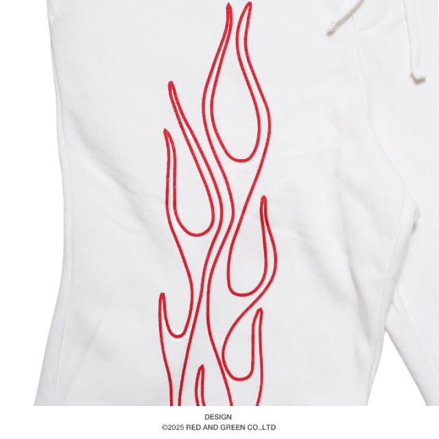フロントの左右に、『ファイヤーパターン』のグラフィックをドロップした、ショート丈のスウェットパンツ。
