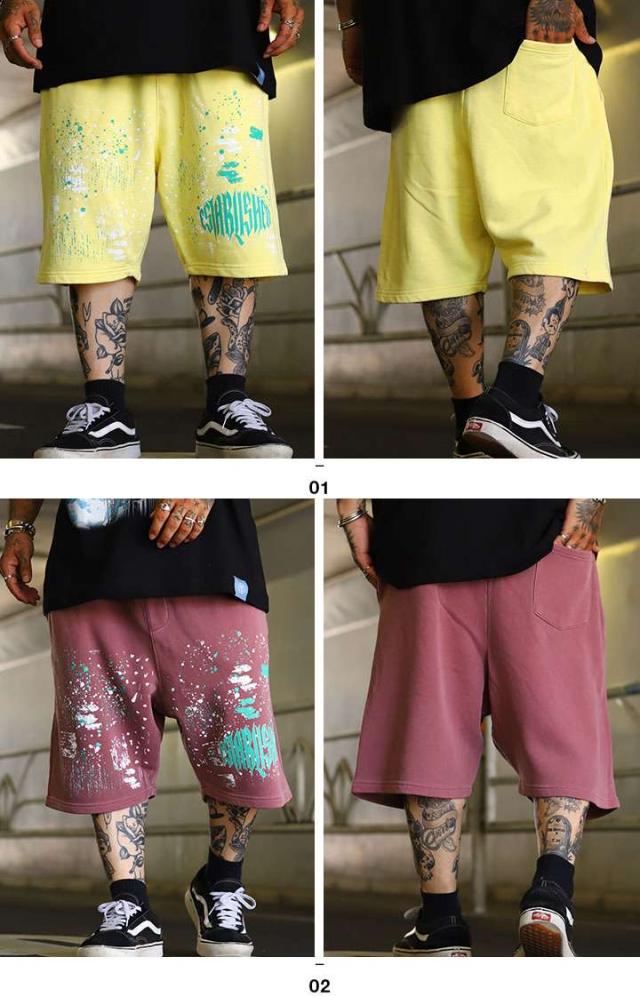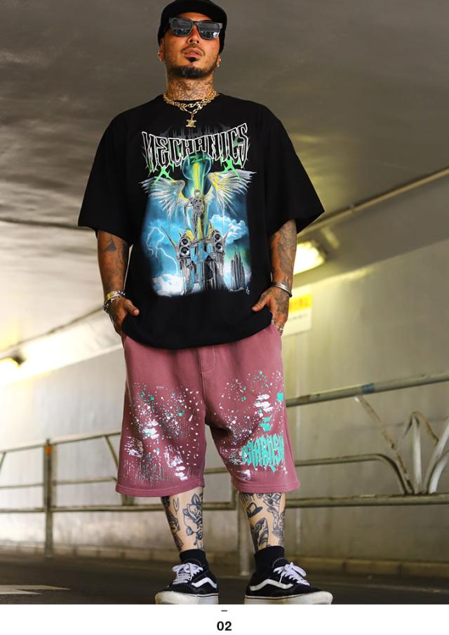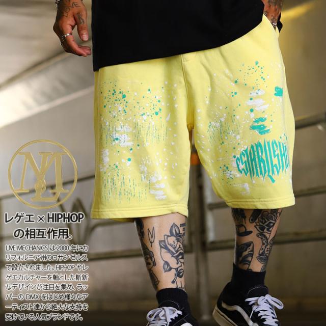 LIVE MECHANICS ハーフパンツ スウェット 半ズボン 短パン メンズ 全2色 大きいサイズ ライブメカニクス ショートパンツ ペイント 飛び散り トライバル文字 ウォッシュド加工 総柄 大人 b系 ヒップホップ ファッション ストリート系 2025春夏 新作 WES4