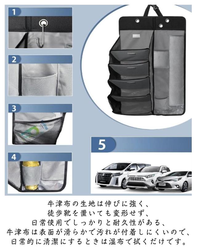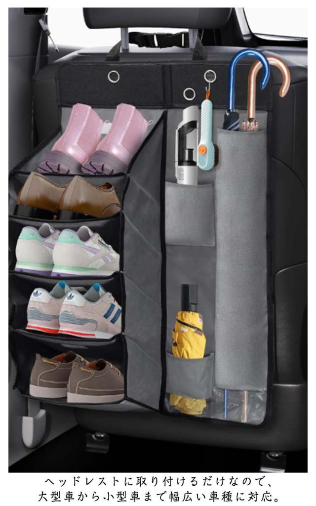 | 【車内必須】 自動車は靴棚、傘カバーを多用する。 車内空間を有効に活用するために設計されており、下駄箱、傘筒、棚として使用でき、傘差込口に排水孔を設けて清潔に保つ。 車用マルチシューズラック&傘入れは土禁車にフィットするように特別に設計されており、車内のスペースを有効に活用できます。 傘差し部には水抜き穴もあり、清潔に車用収納ラックを保てます。ウェットスポンジまたはウェットタオルで簡単にきれいにする。 ヘッドレストに取り付けるだけなので、大型車から小型車まで幅広い車種に対応。 工具は一切必要なし!取付時間は僅か10 秒間!ベルトをヘッドレストに通し、マジックテープをシートバックに貼り付けて装着済み! コンパクトボディには5つの仕切り+ 4つの収納袋が含まれており、靴、傘、小物は分類して整理し、サイドネット袋には携帯電話、ベビー用品を入れ、上部ポケットにはマグカップを収納し、リングには清潔ブラシをかけることができる。 牛津布の生地は伸びに強く、徒歩靴を置いても変形せず、日常使用でしっかりと耐久性がある、牛津布は表面が滑らかで汚れが付着しにくいので、日常的に清潔にするときは湿布で拭くだけです。 | |