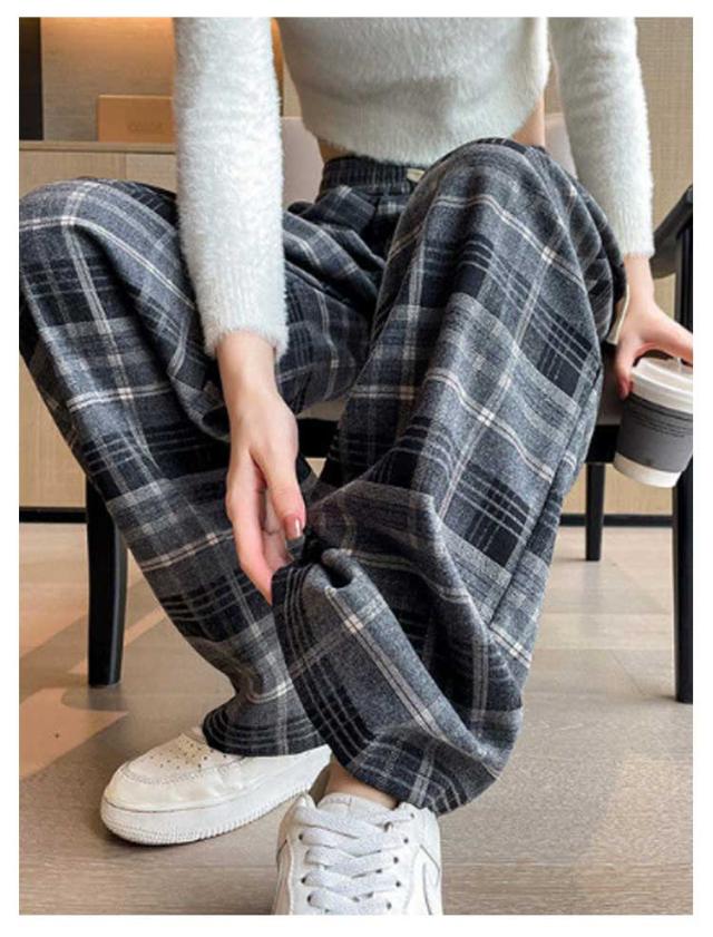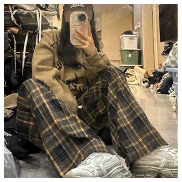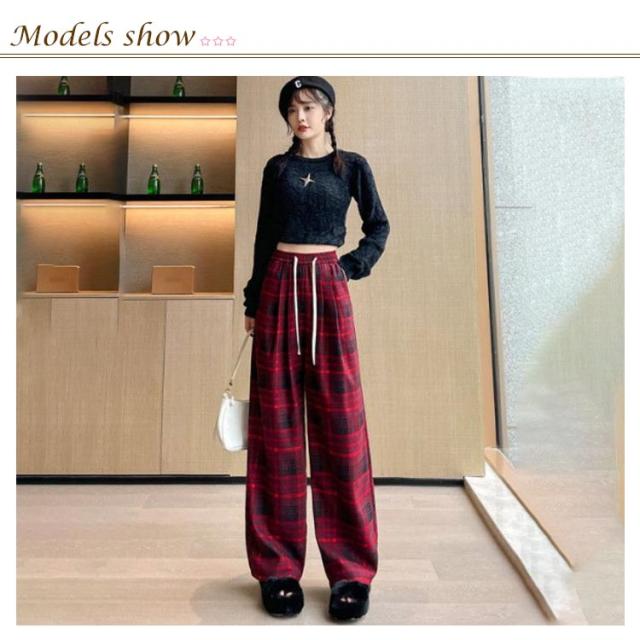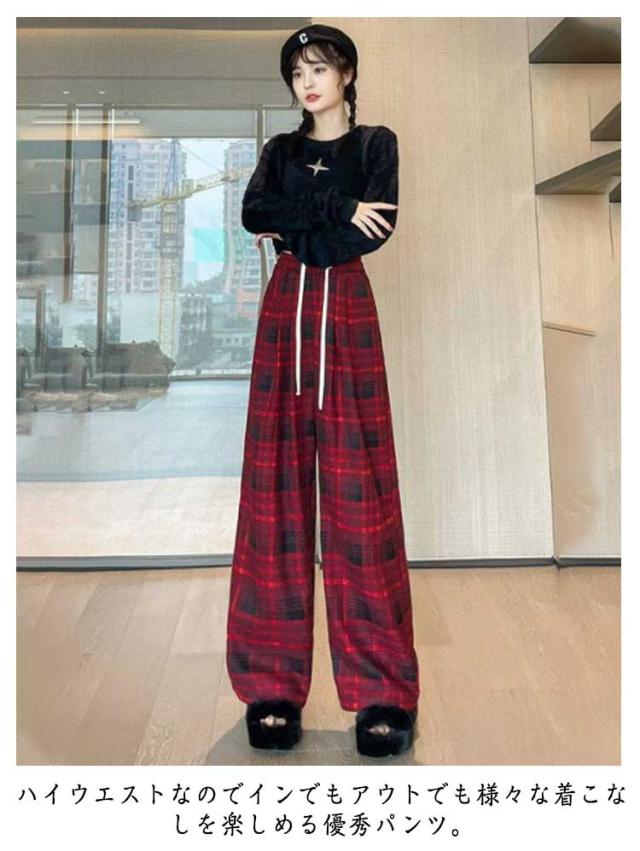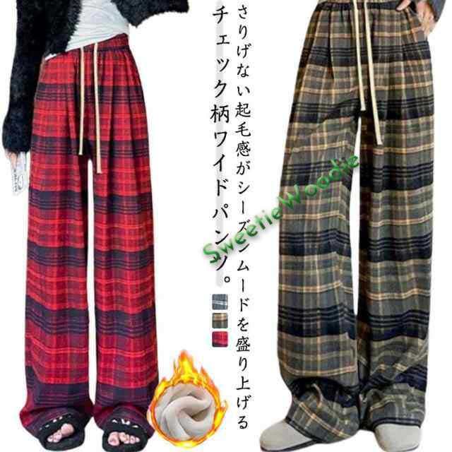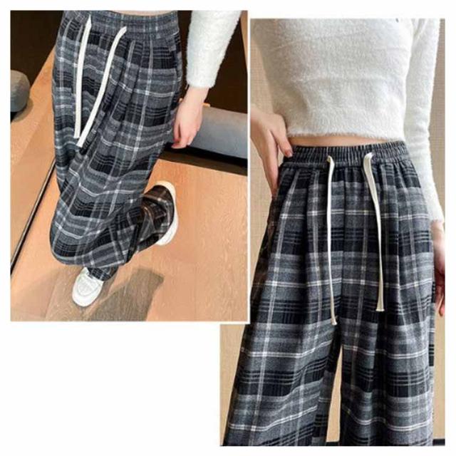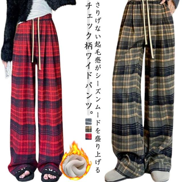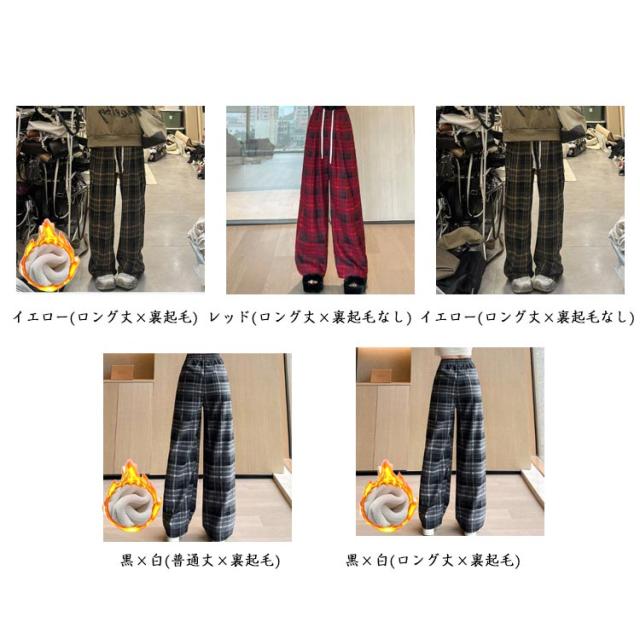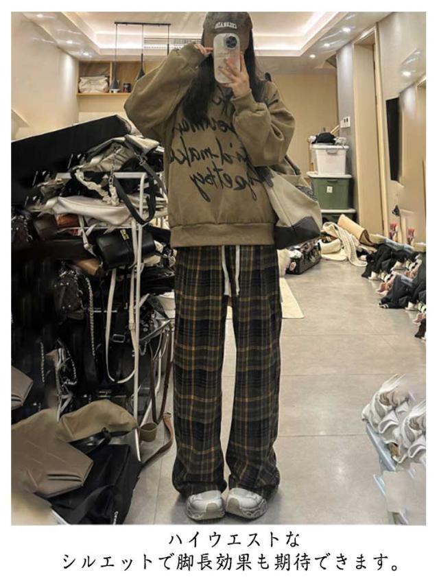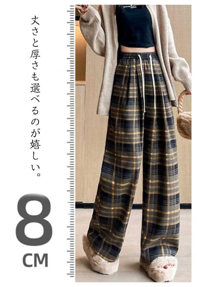 ストレートパンツ グレンチェック ロング丈 ワイドパンツ ウールタッチ チェック柄 ロングパンツ ゆったり ストレート 体型カバー 脚長効果 長ズボン 秋 冬